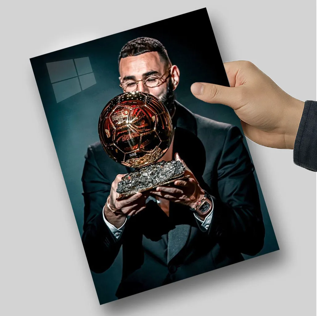 متال پوستر بنزما با توپ طلا لحظهای نمادین از افتخار و دستاوردهای بزرگ این مهاجم افسانهای را به تصویر میکشد. این طرح نشاندهنده پیروزی، تلاش مستمر و اعتبار جهانی کریم بنزما در فوتبال است.